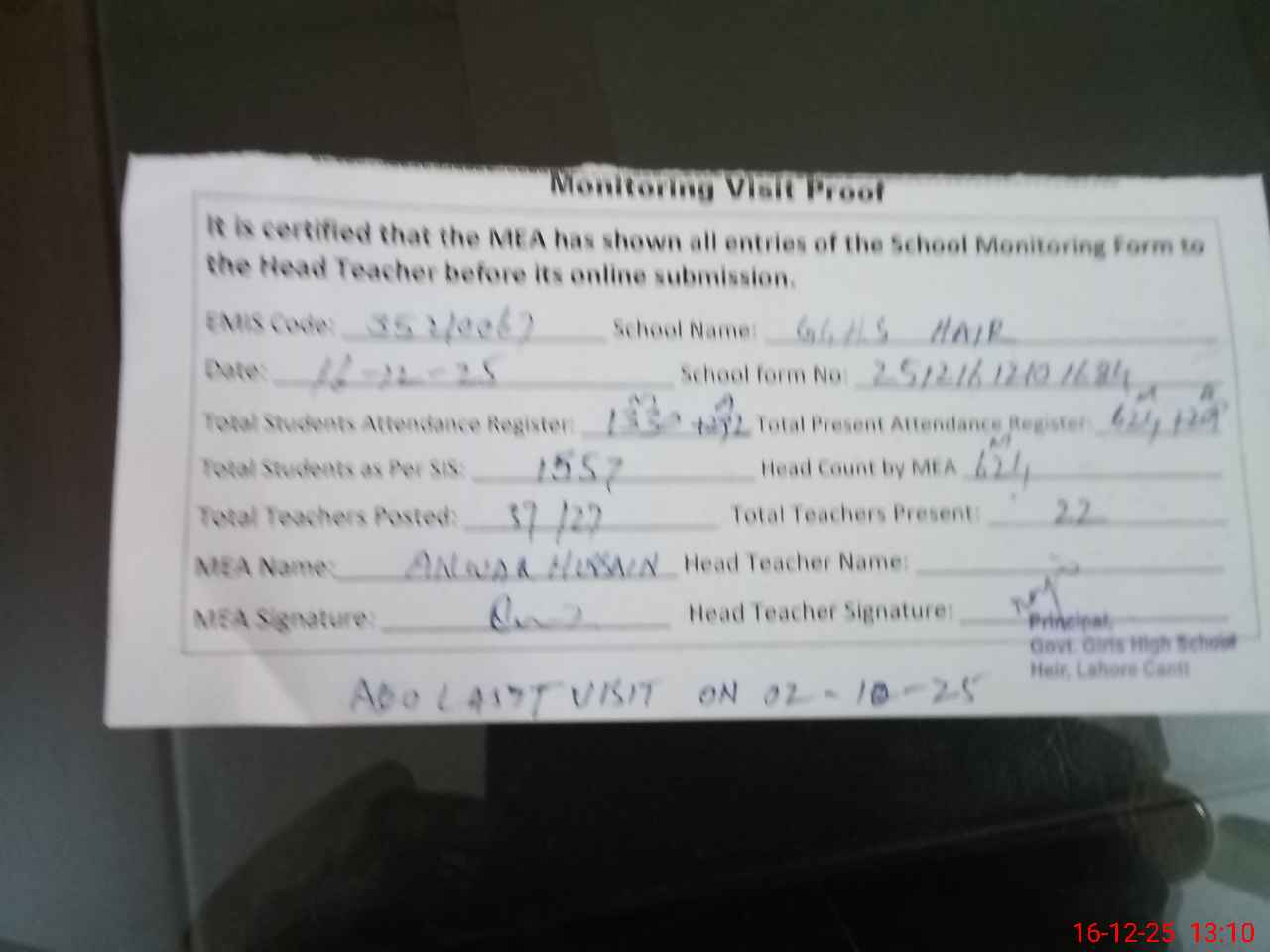 | Remarks (Use Separate Page if Required): Lubna Naveed SST attached to this School from GGHSS Sing Pura 22 September 2025 with out any written order AEO Last visit on 02 October 2025 35210067 | |||||