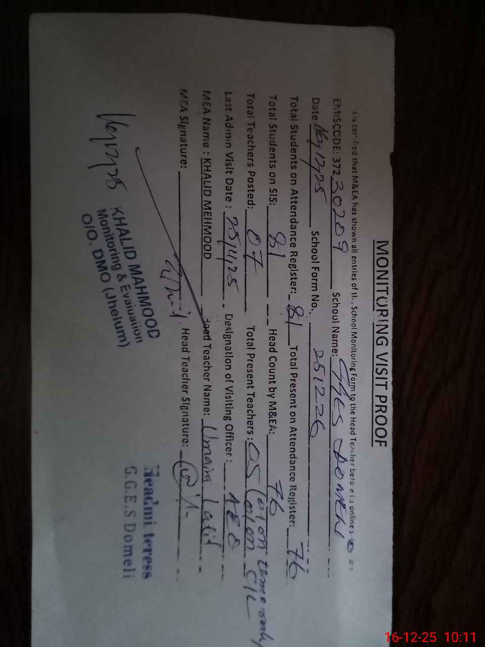 | Certified that this School was Inspected by the Undersigned MEA/DMO Today and the Information Stated Above is as Per Record. | |||||