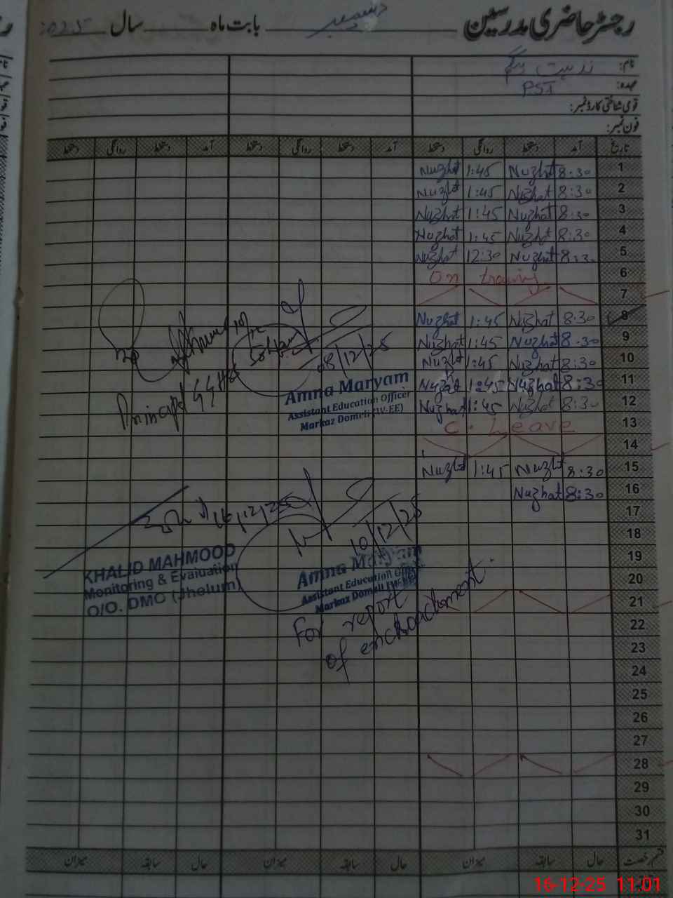 | CNIC | Full Name | Designation | R/C | Absence During Last Calender Month |