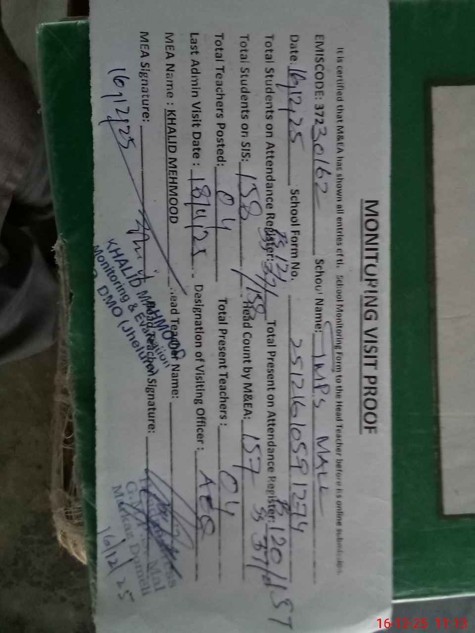 | Attendance Register | Head Teacher | MEA with School | Visit Proof |