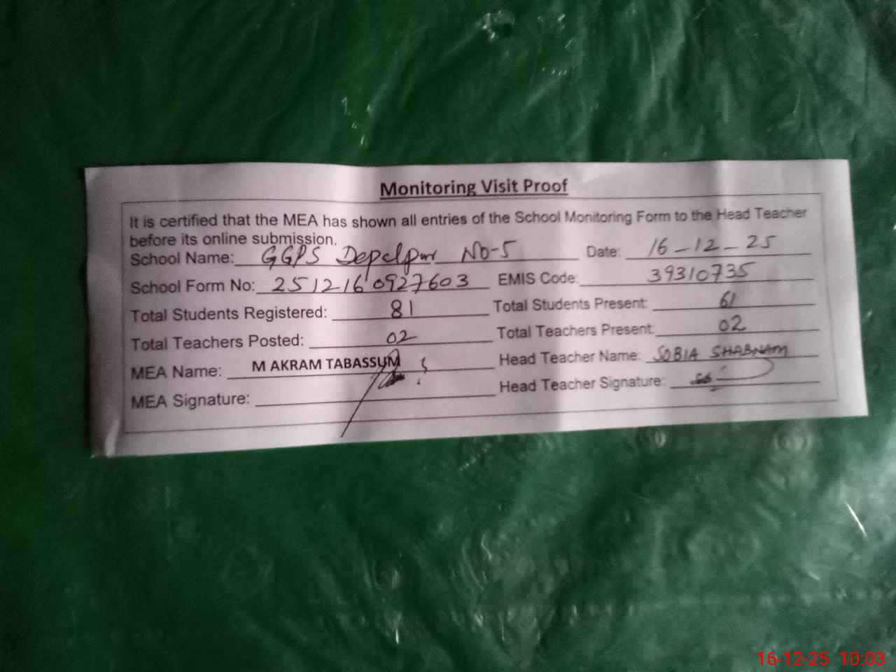 | EMIS Code: 39310735 | Name of School: GGPS NO 5 DEPALPUR | |||