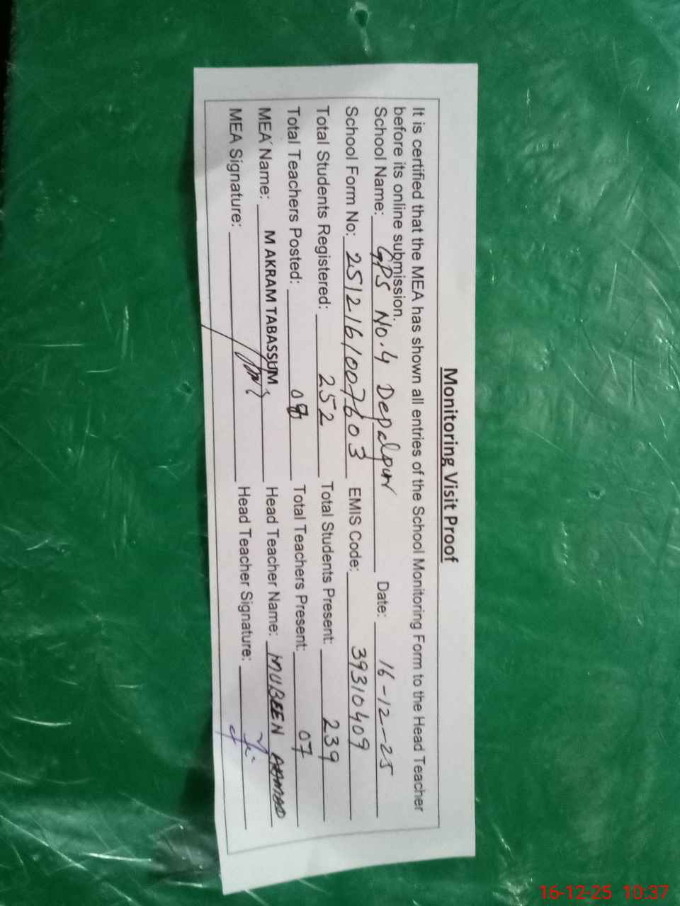 | Attendance Register | Head Teacher | MEA with School | Visit Proof |