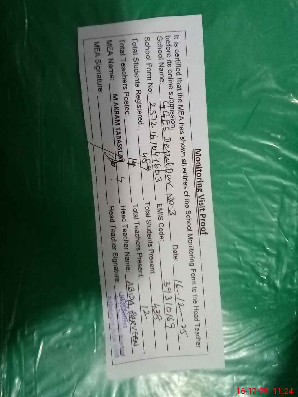 | Attendance Register | Head Teacher | MEA with School | Visit Proof |