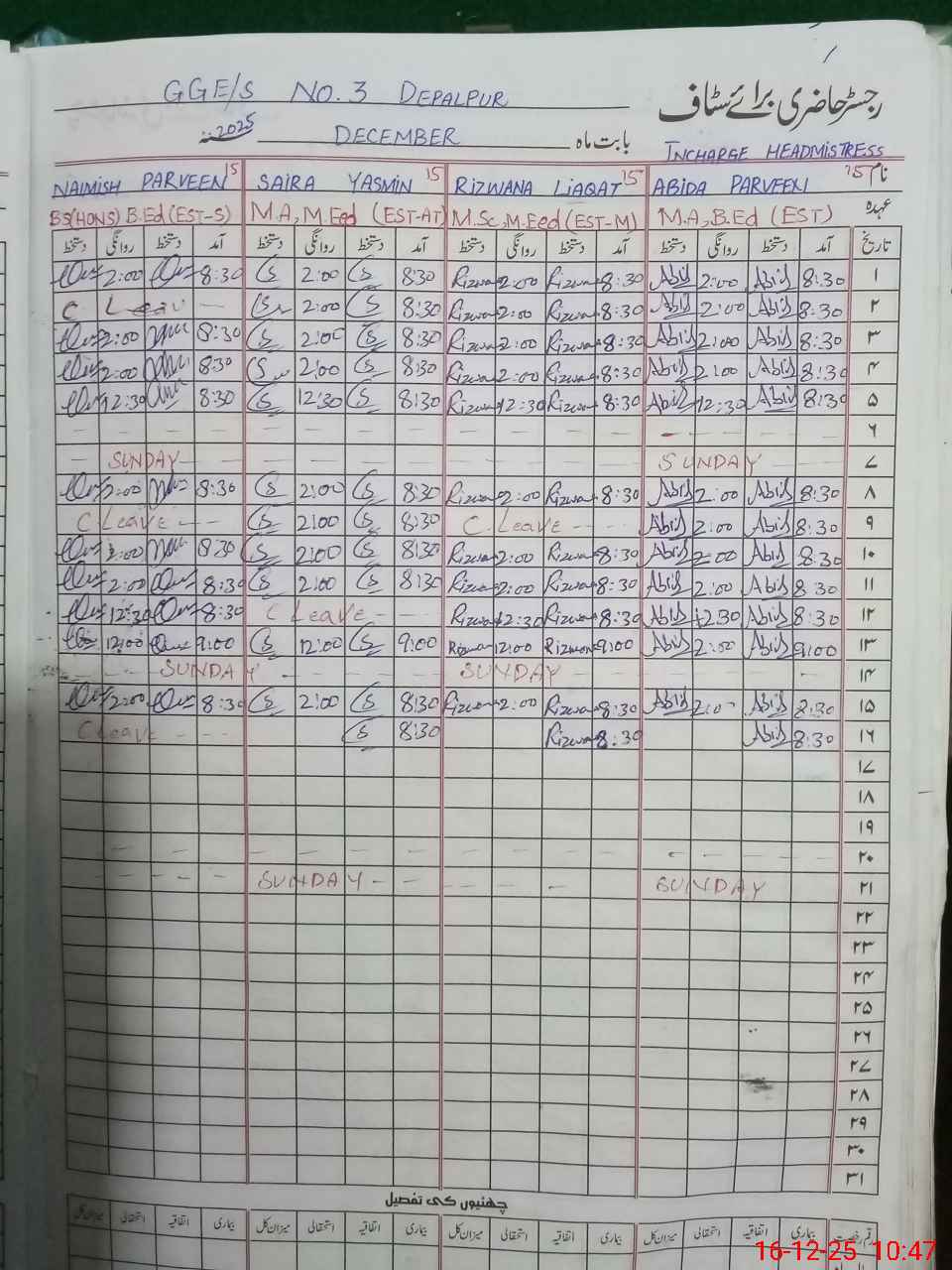 | CNIC | Full Name | Designation | R/C | Absence During Last Calender Month |