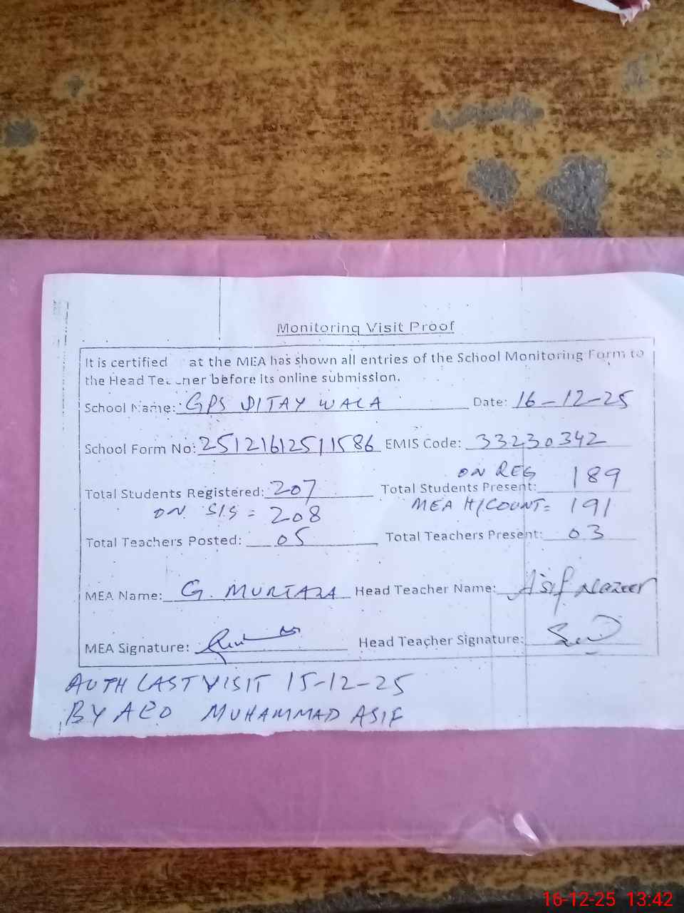 | EMIS Code: 33230342 | Name of School: GPS DITAY WALA | |||