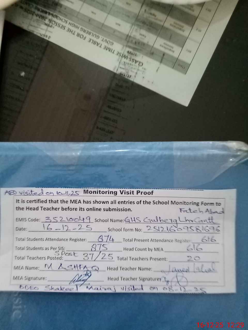 | Remarks (Use Separate Page if Required): PST Muhammad Bilal on Polio duty but his written Orders not available so mark him absent Teachers Sanctioned Post 37 and Filled 25 DDEO Shakeel Mairaj visited on 08-12-25 AEO M Imran visited on 10-11-25 School has total toilets 14 while 06 toilets are non functional due to outer side blockage Naib Qasid Faheem on attached with DEO office but his latest orders not available so mark him absent School has large ground but no proper grass planted at here looking so muddy 35210049 | |||||