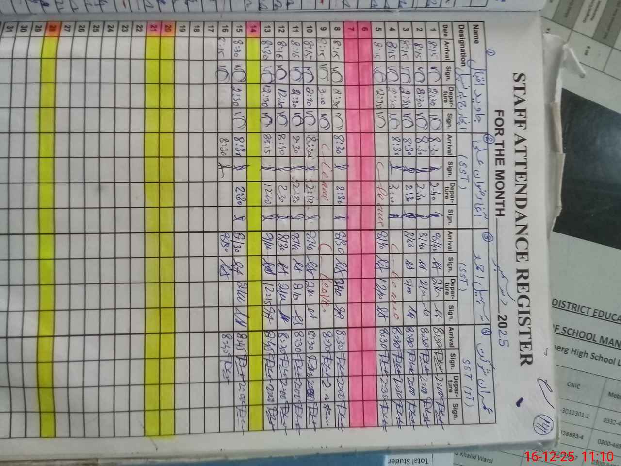 | CNIC | Full Name | Designation | R/C | Absence during last cal. month |
