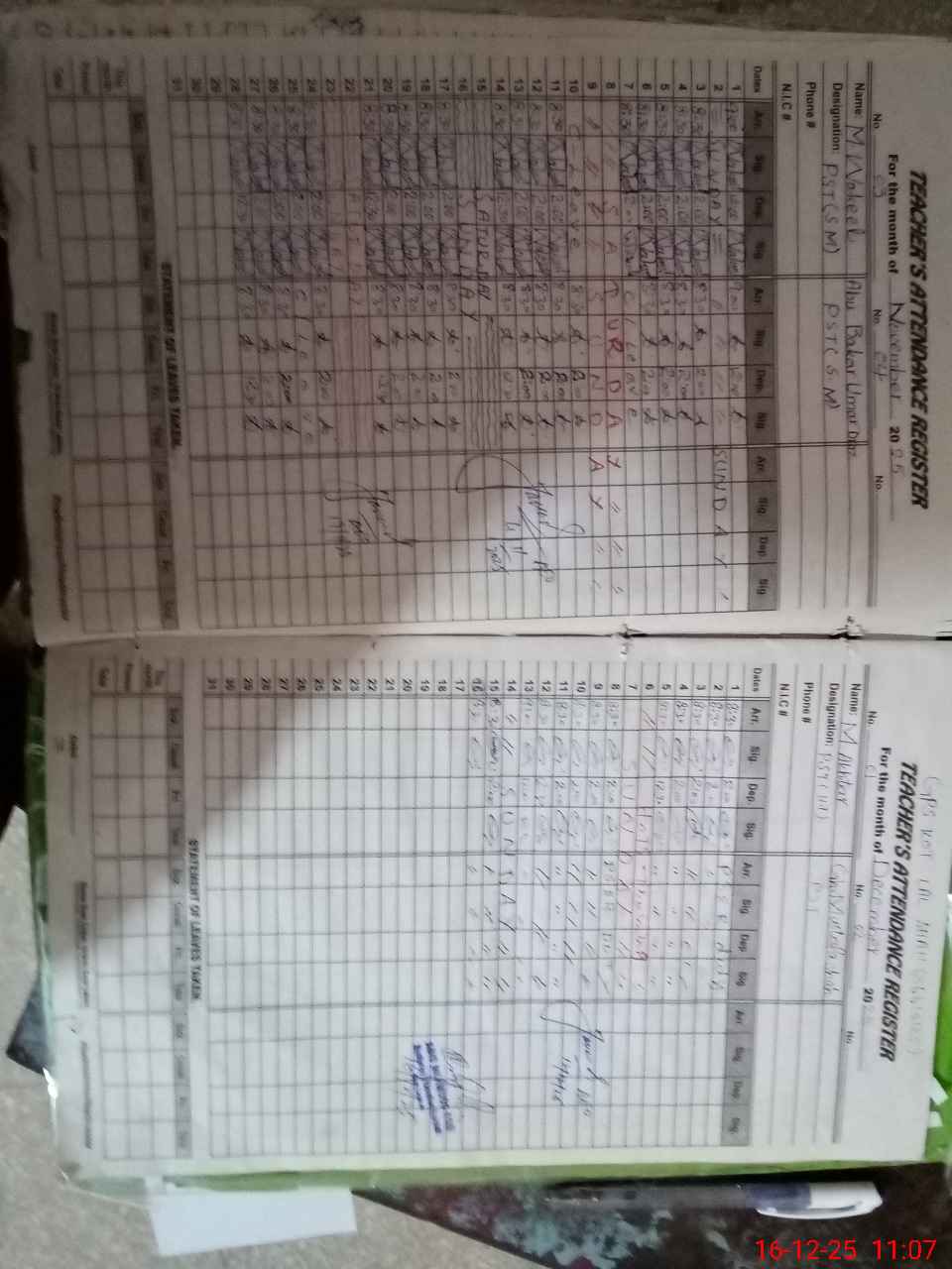 | CNIC | Full Name | Designation | R/C | Absence During Last Calender Month |