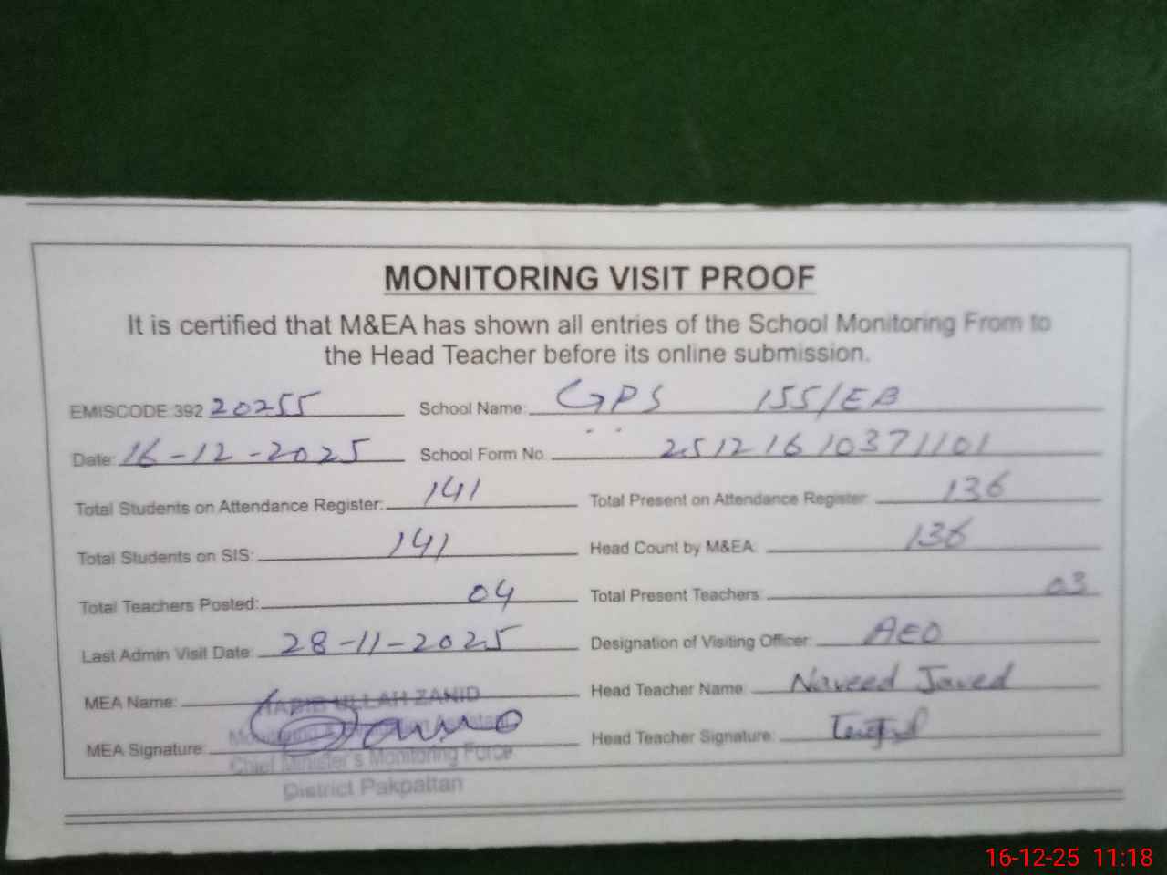 | Attendance Register | Head Teacher | MEA with School | Visit Proof |