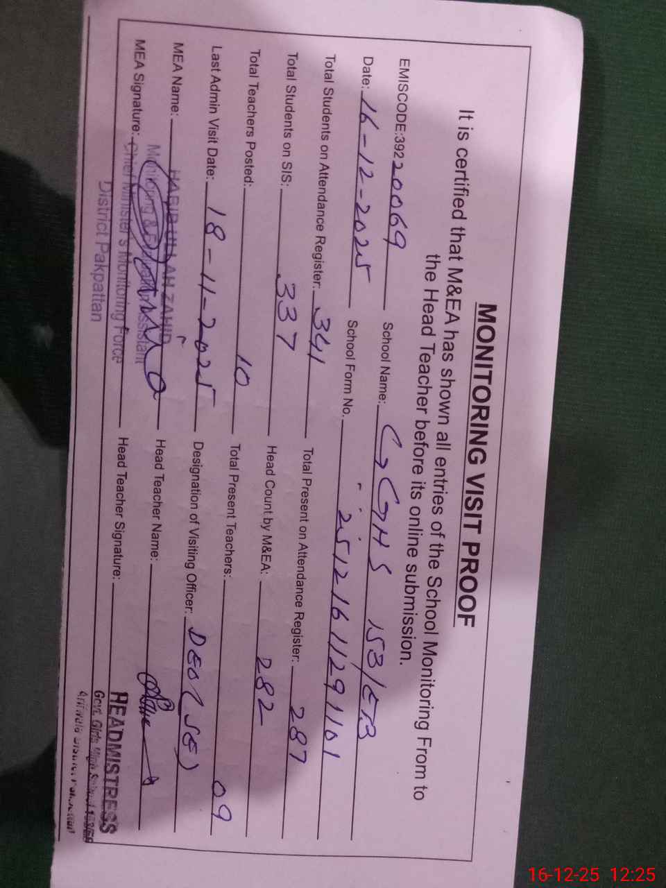 | EMIS Code: 39220069 | Name of School: GGHS 153 EB POST OFFICE CHAK NO 153 EB | |||