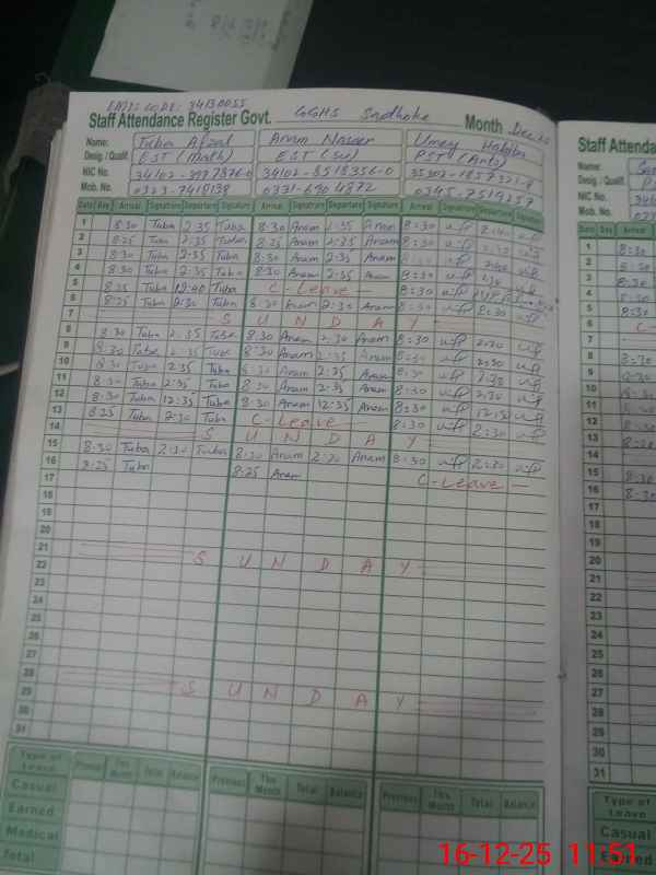 | CNIC | Full Name | Designation | R/C | Absence During Last Calender Month |