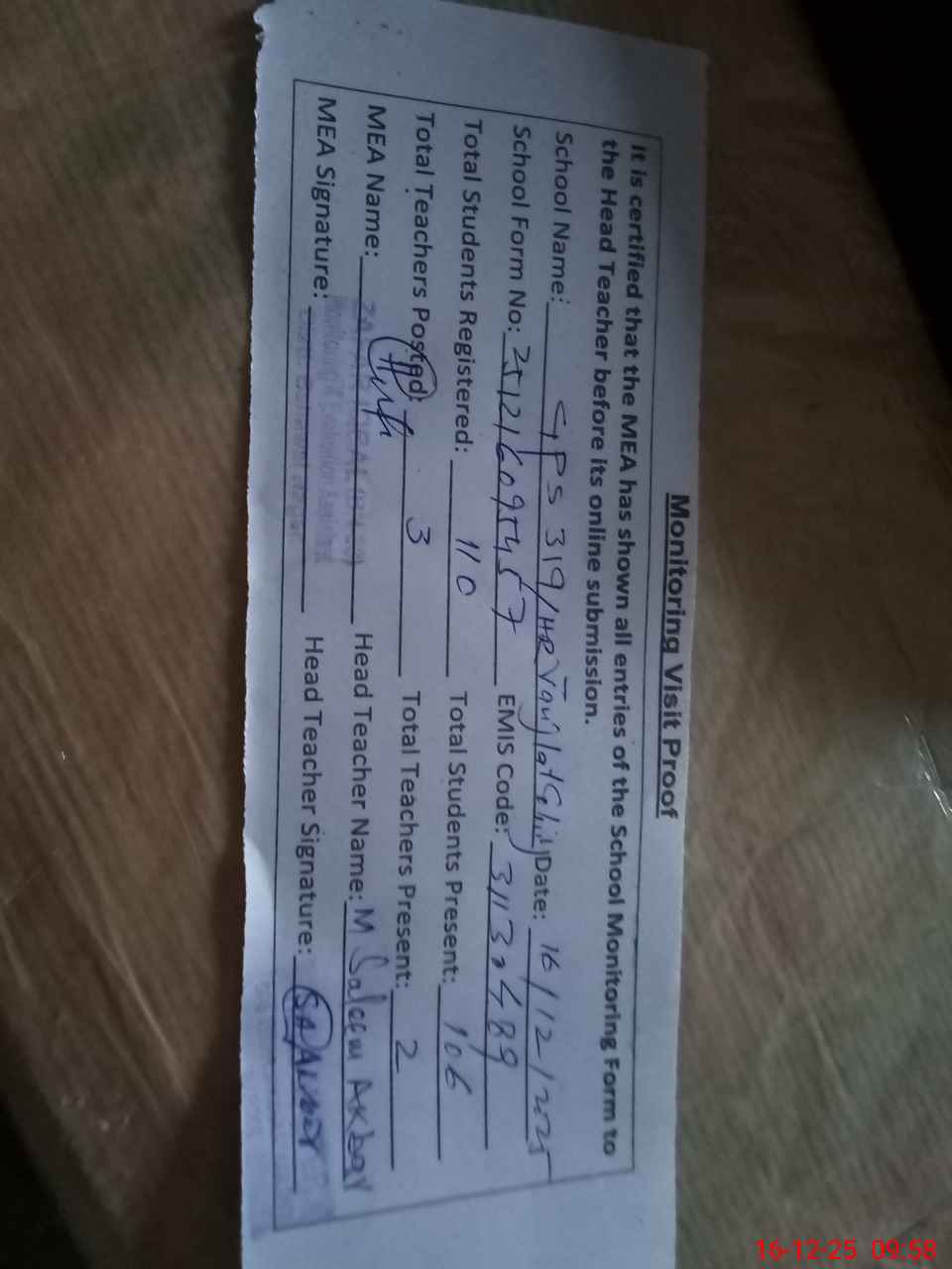 | Attendance Register | Head Teacher | MEA with School | Visit Proof |