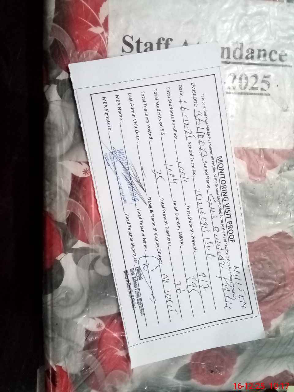 | Attendance Register | Head Teacher | MEA with School | Visit Proof |