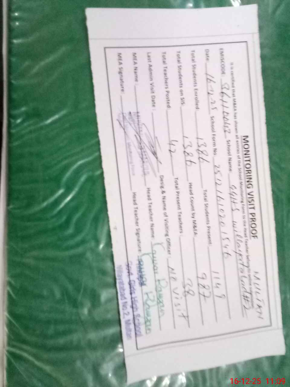 | Monitoring Date: 16-12-2025 | Start Time: 16-12-2025 10:20 AM | End Time: 16-12-2025 11:09 AM | Name of MEA: Mu**** Ma**** | |