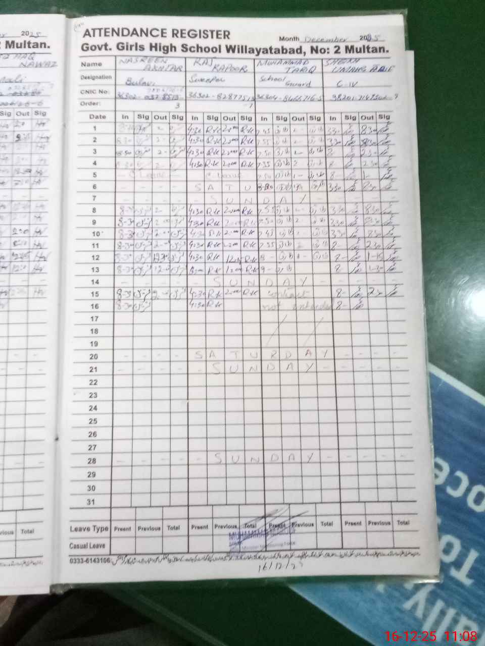 | CNIC | Full Name | Designation | R/C | Absence during last cal. month |