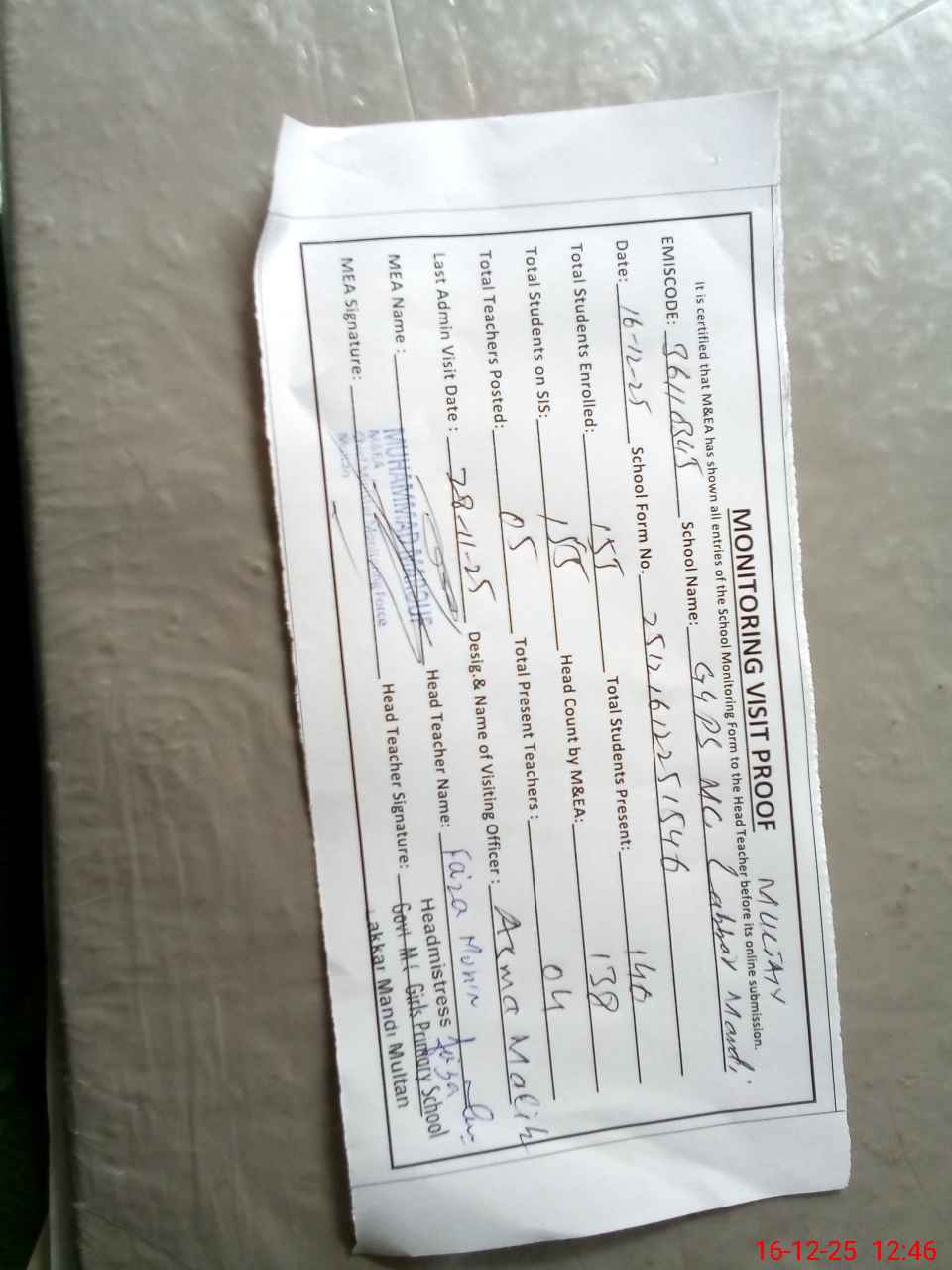 | Attendance Register | Head Teacher | MEA with School | Visit Proof |