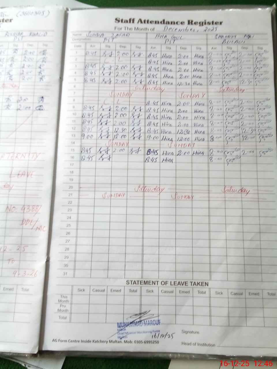 | CNIC | Full Name | Designation | R/C | Absence During Last Calender Month |