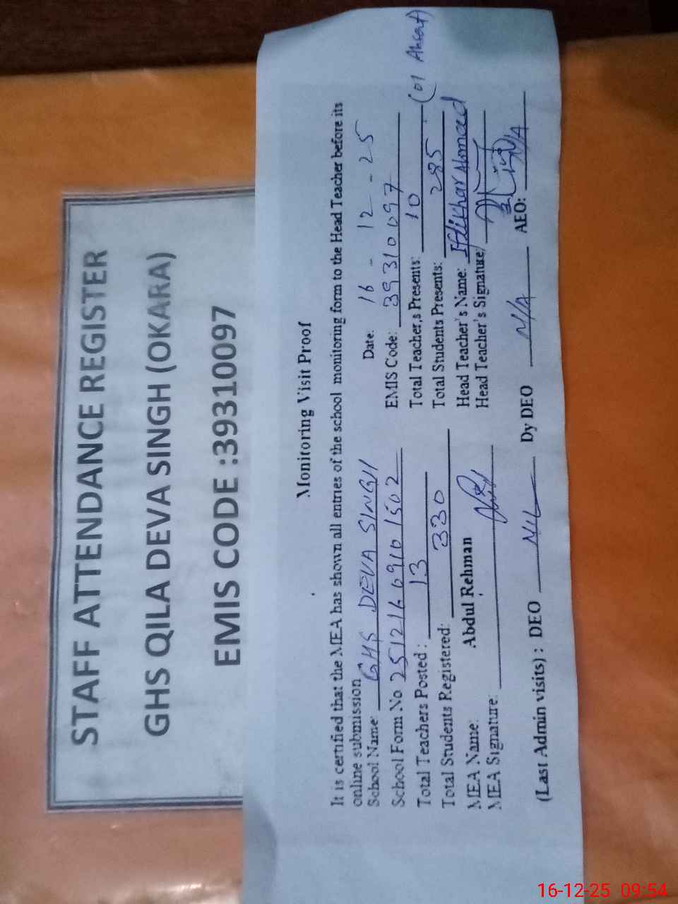 | Attendance Register | Head Teacher | MEA with School | Visit Proof |