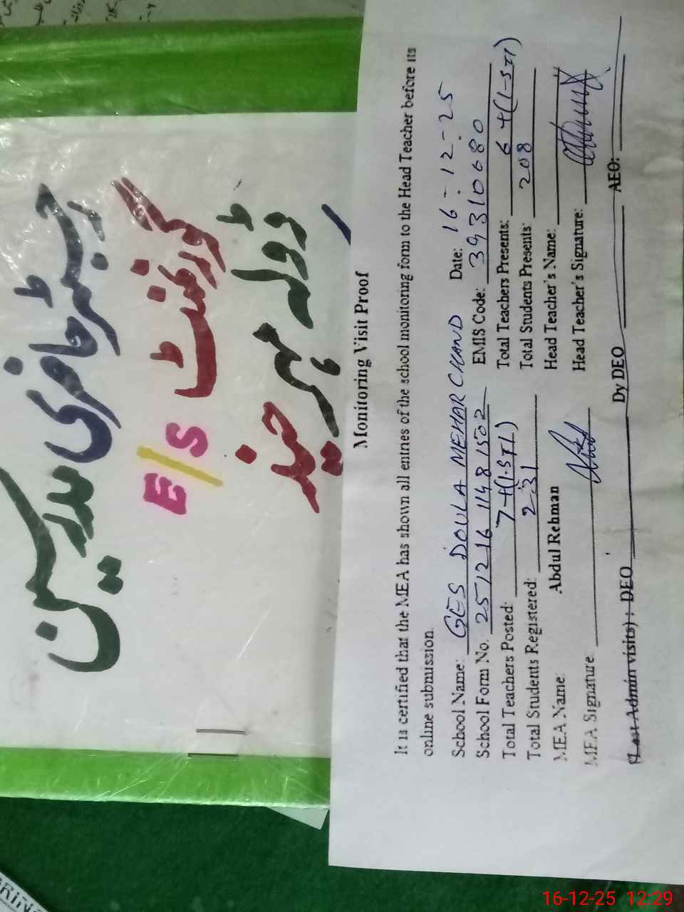 | Attendance Register | Head Teacher | MEA with School | Visit Proof |