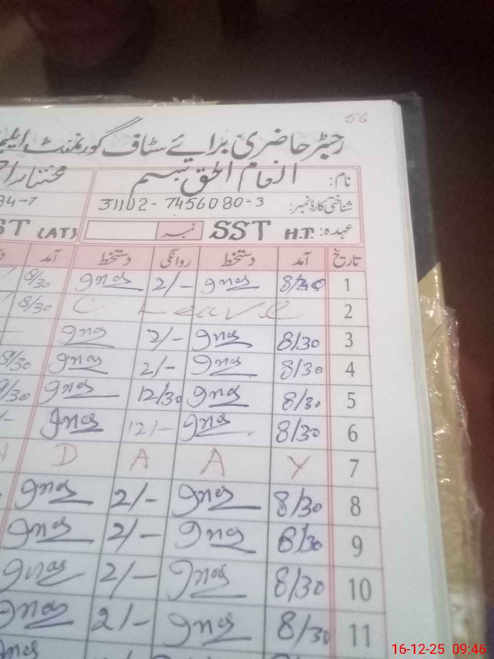| CNIC | Full Name | Designation | R/C | Absence during last cal. month |