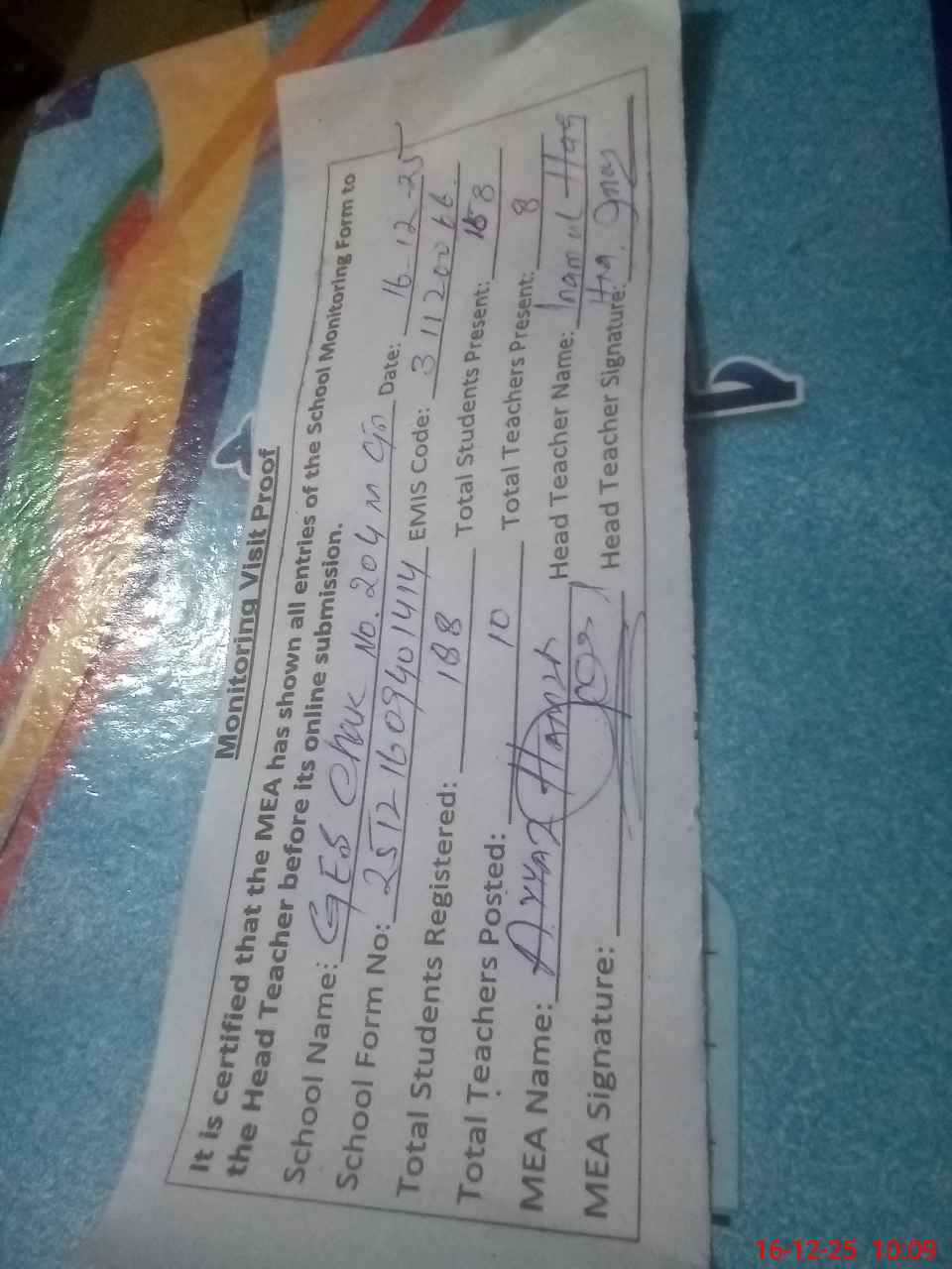 | Attendance Register | Head Teacher | MEA with School | Visit Proof |