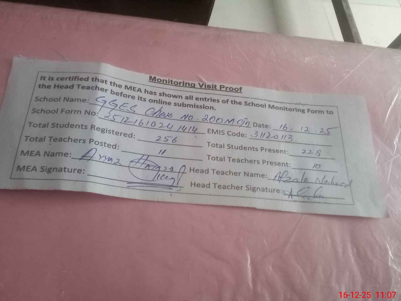 | EMIS Code: 31120113 | Name of School: GGES CHAK NO. 200/M | |||