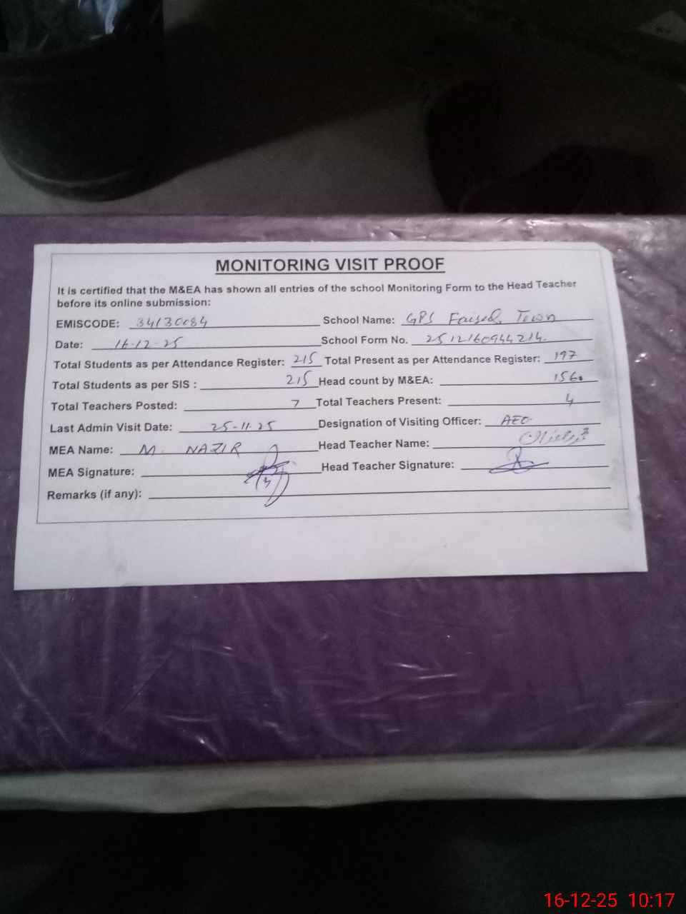 | EMIS Code: 34130084 | Name of School: GPS FAISAL TOWN (VIRAK TOWN) | |||