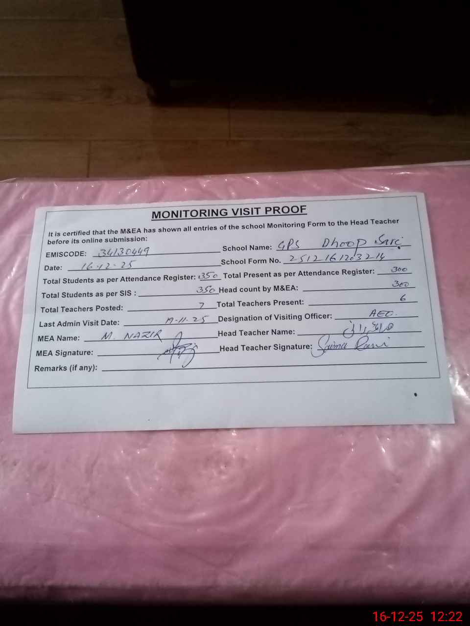 | Attendance Register | Head Teacher | MEA with School | Visit Proof |