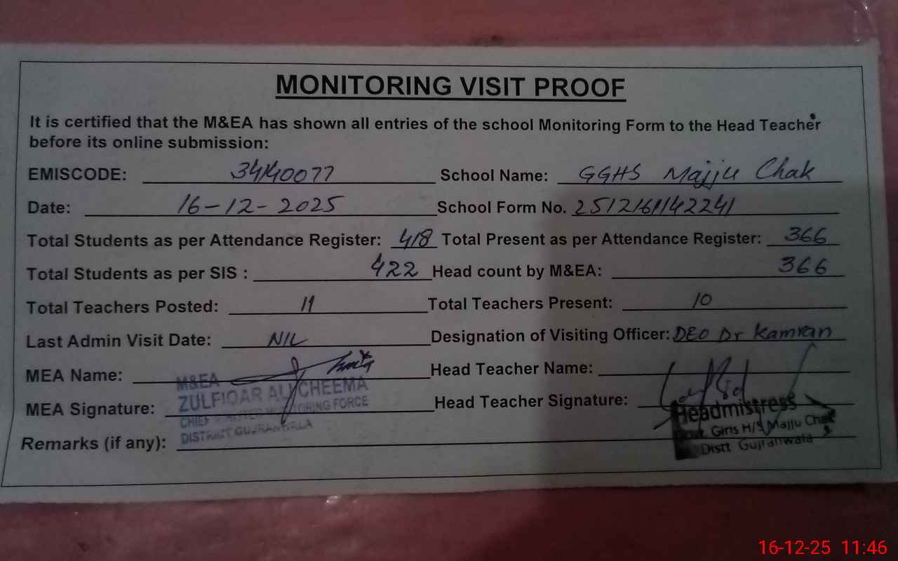 | EMIS Code: 34140077 | Name of School: GGHS MAJJU CHAK | |||