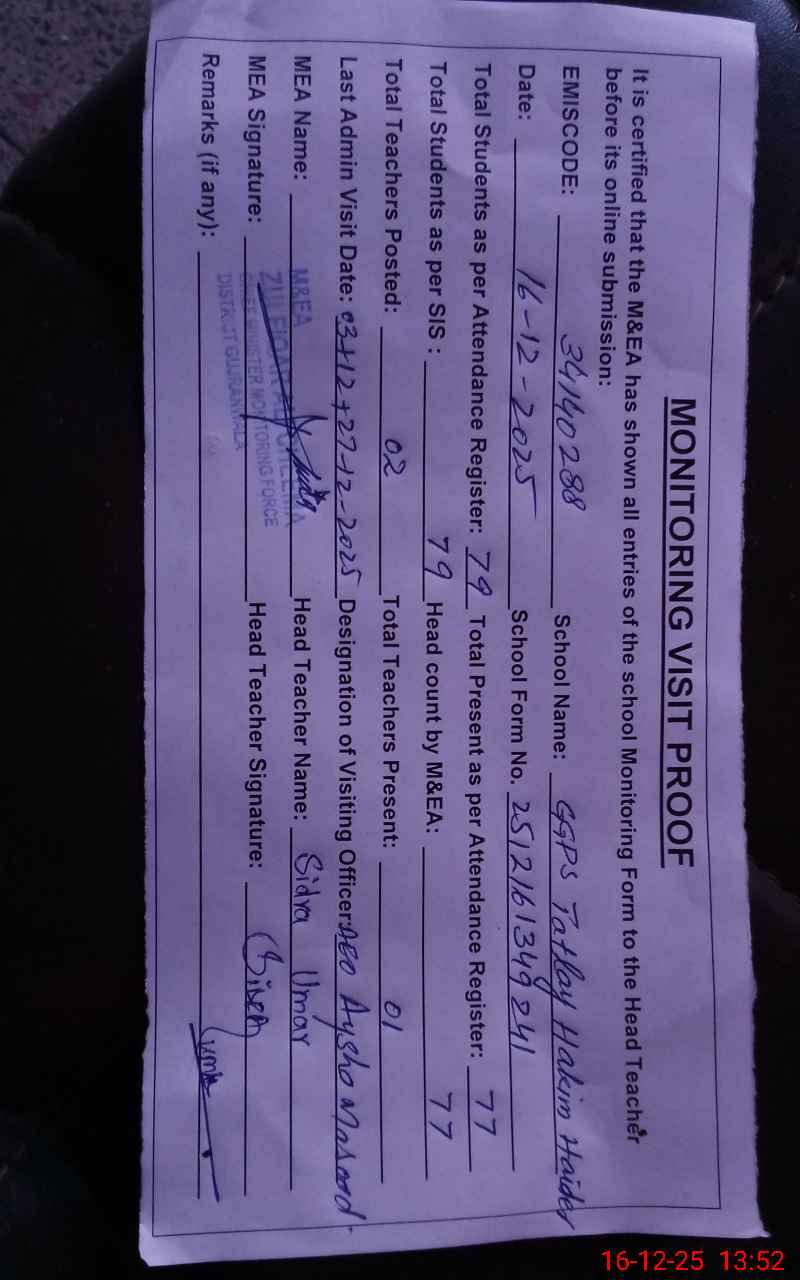 | EMIS Code: 34140288 | Name of School: GGPS TATLAY HAKIM HAIDER | |||