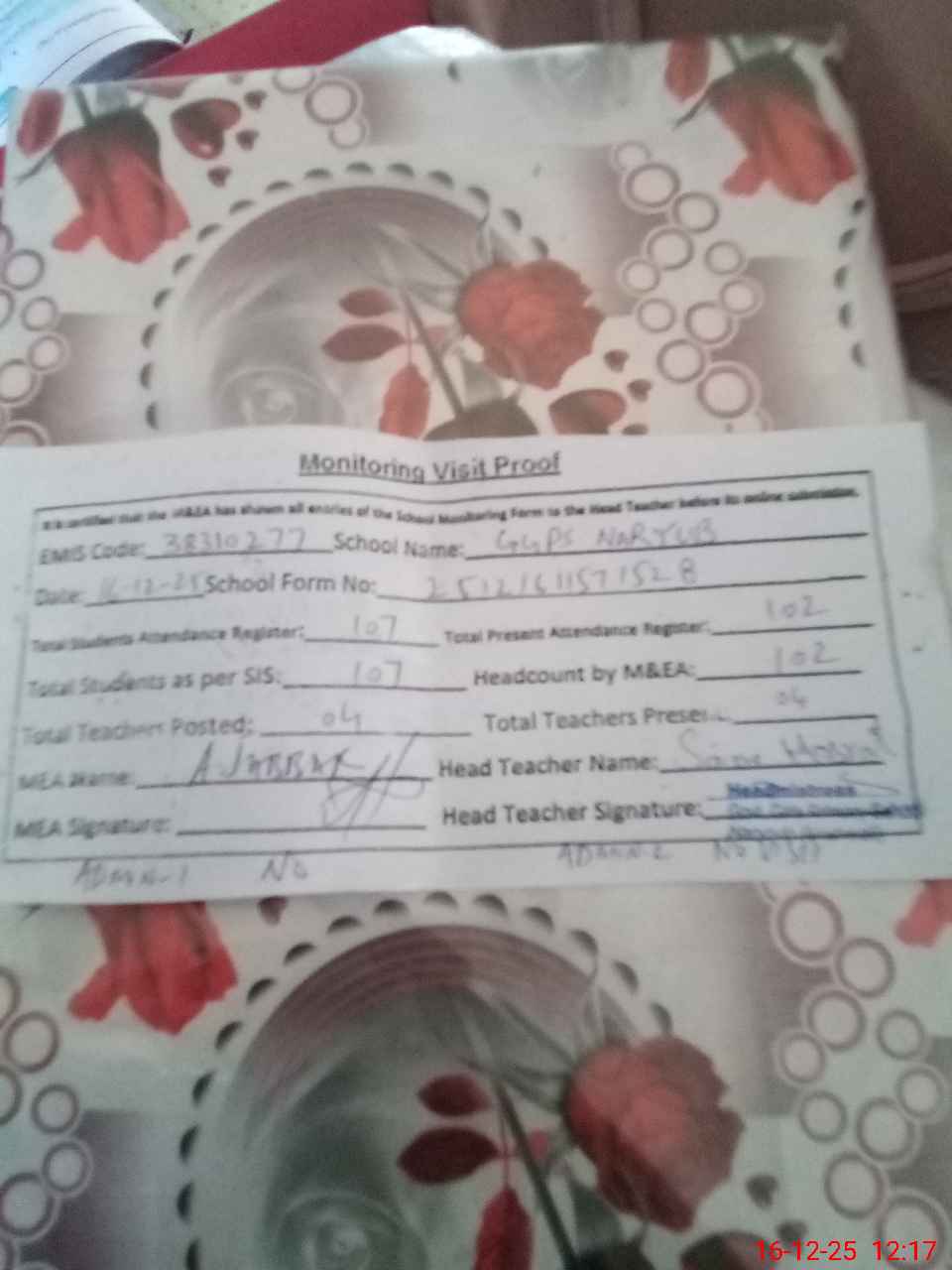 | Attendance Register | Head Teacher | MEA with School | Visit Proof |