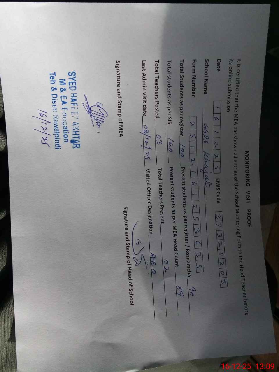 | Remarks (Use Separate Page if Required): Teacher Wajiha Zafar PST Sci Maths is un authorised absent since 25th June 2025. NSB record not updated in pmiu app | |||||