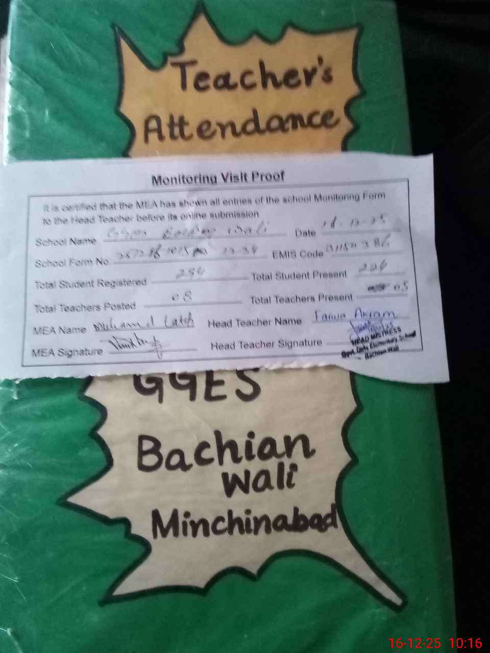 | Attendance Register | Head Teacher | MEA with School | Visit Proof |