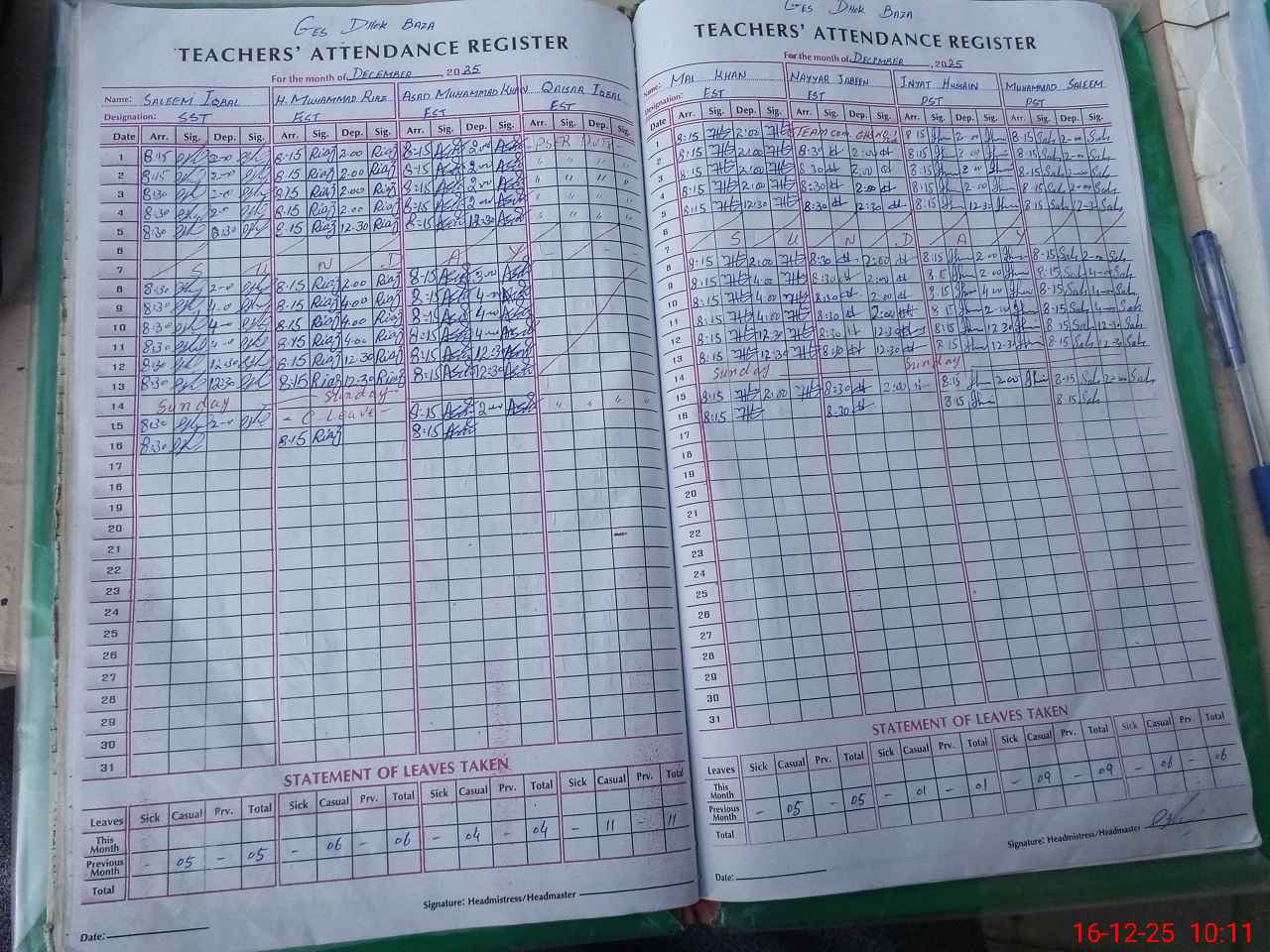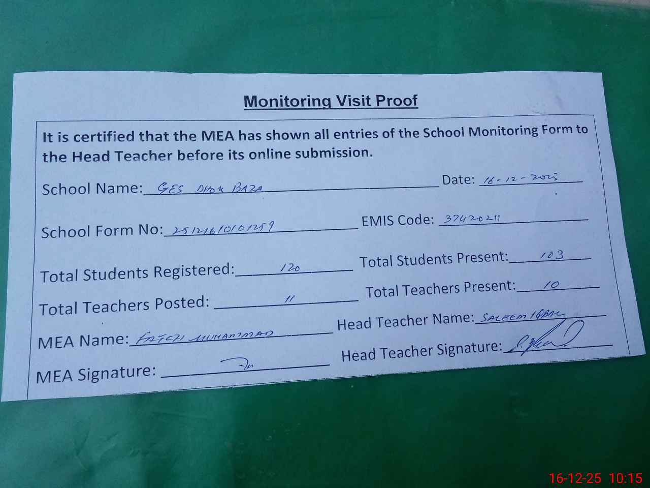 | Attendance Register | Head Teacher | MEA with School | Visit Proof |