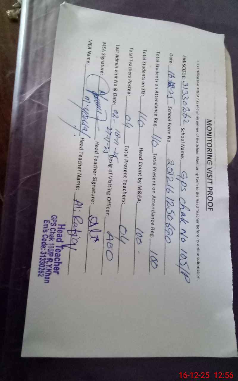 | EMIS Code: 31330262 | Name of School: GPS CHAK 105/P | |||