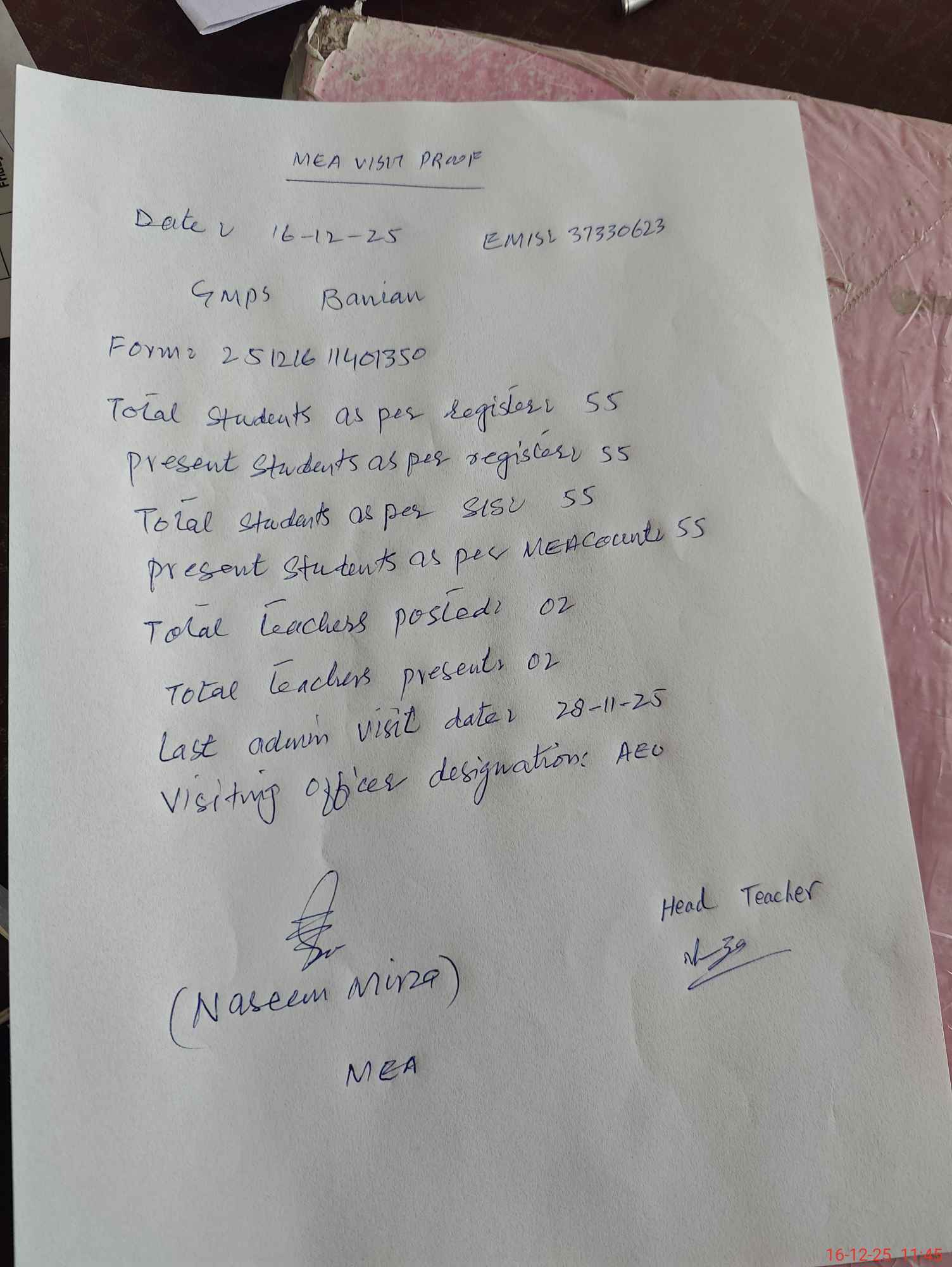 | Attendance Register | Head Teacher | MEA with School | Visit Proof |