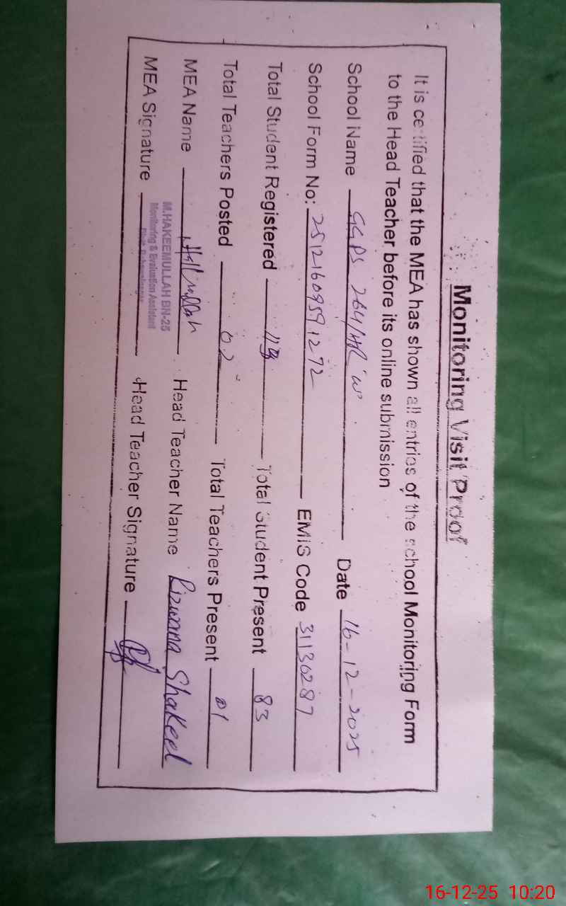| EMIS Code: 31130287 | Name of School: GGPS CHAK NO. 264 HR W | |||
