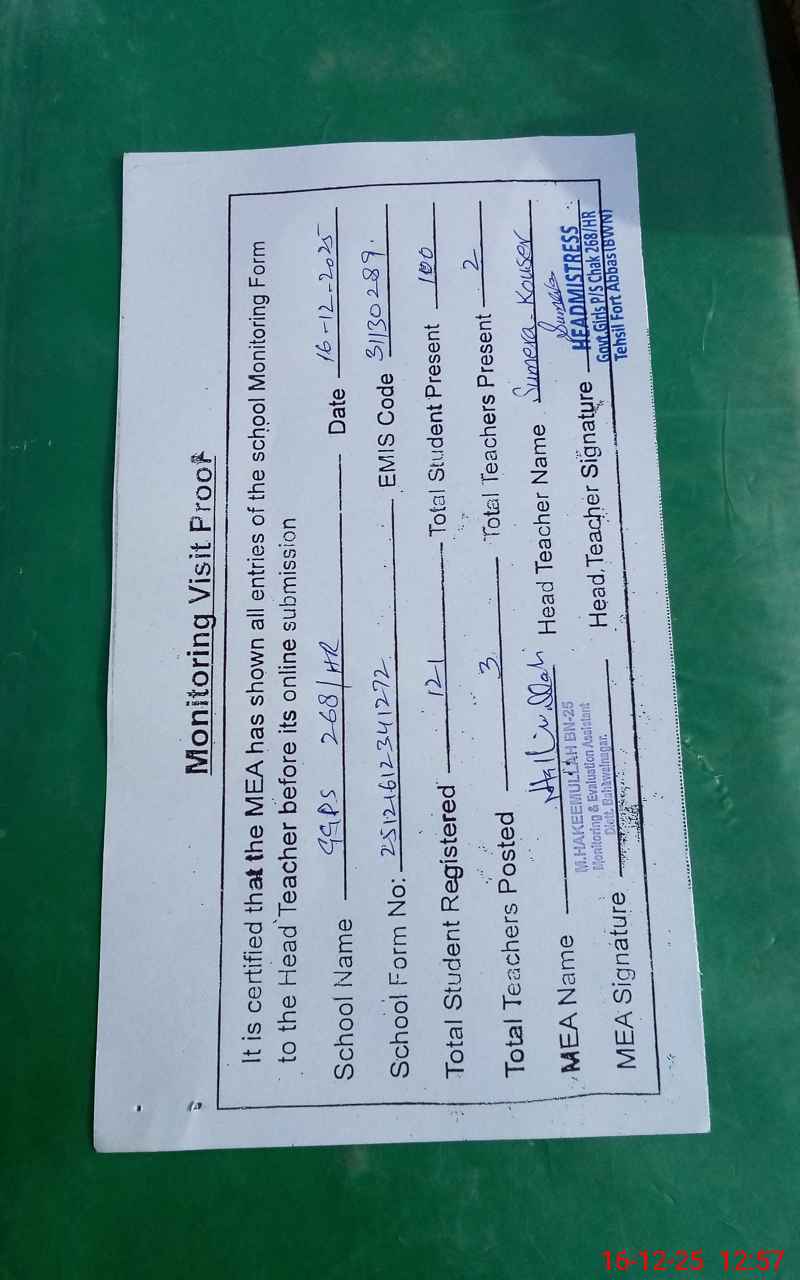 | EMIS Code: 31130289 | Name of School: GGPS CHAK NO 268 HR | |||