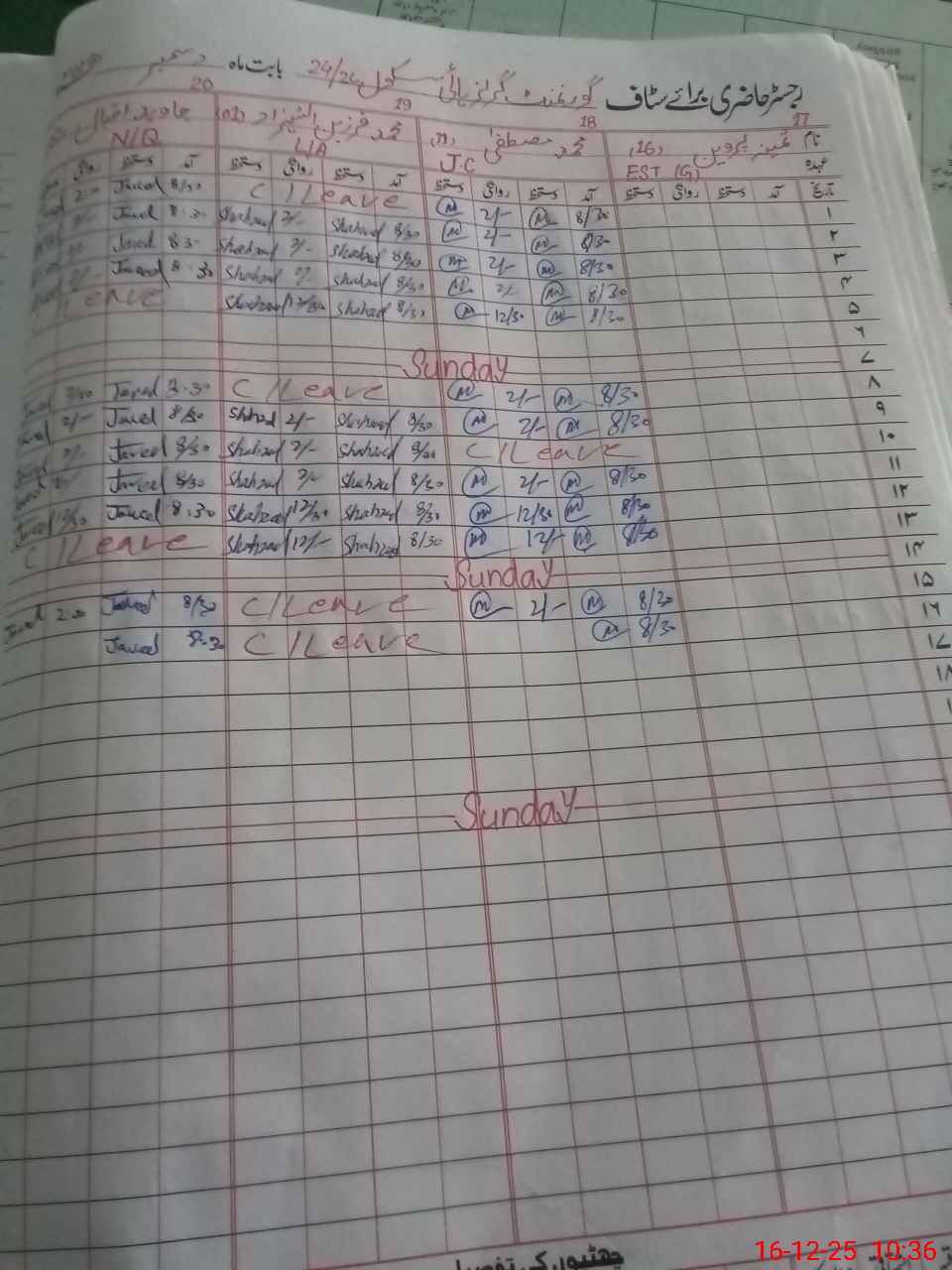 | CNIC | Full Name | Designation | R/C | Absence During Last Calender Month |