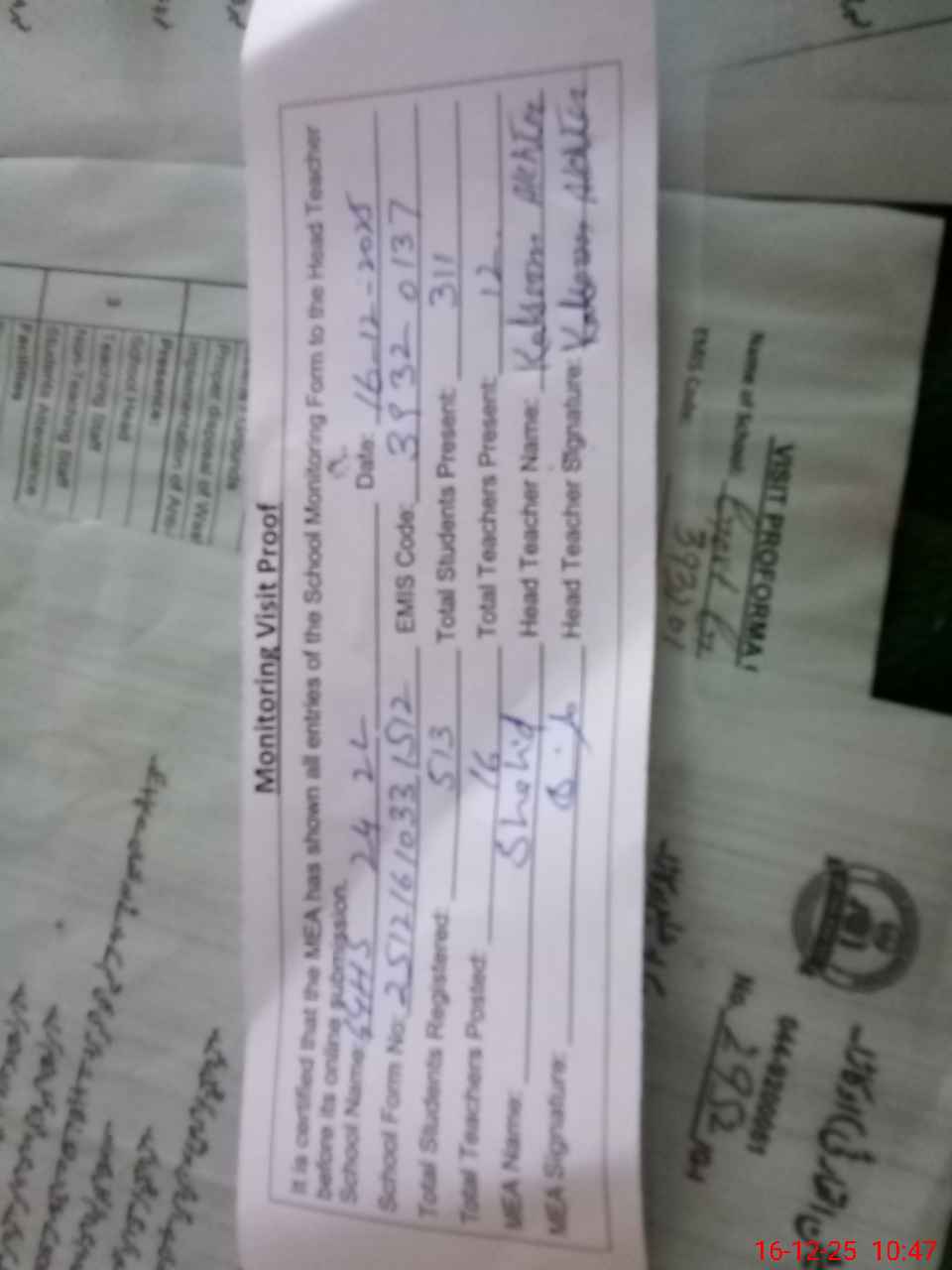 | Attendance Register | Head Teacher | MEA with School | Visit Proof |