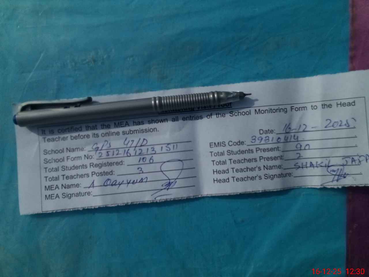 | Attendance Register | Head Teacher | MEA with School | Visit Proof |