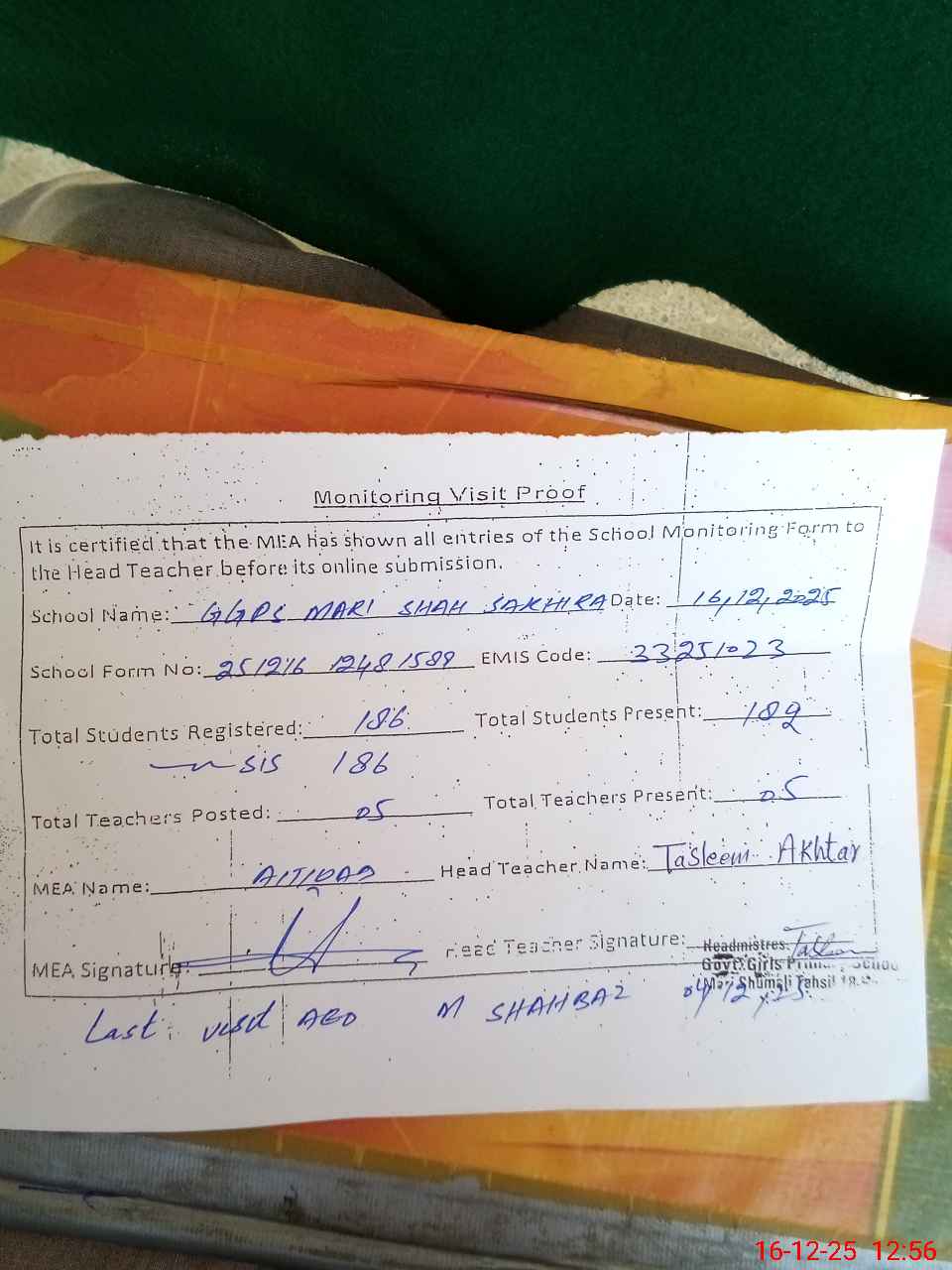 | EMIS Code: 33251023 | Name of School: GGPS MARI SHAH SAKHERA SHUMALI | |||