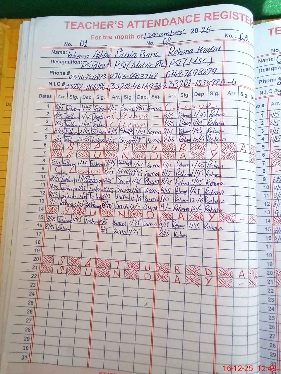 | CNIC | Full Name | Designation | R/C | Absence During Last Calender Month |
