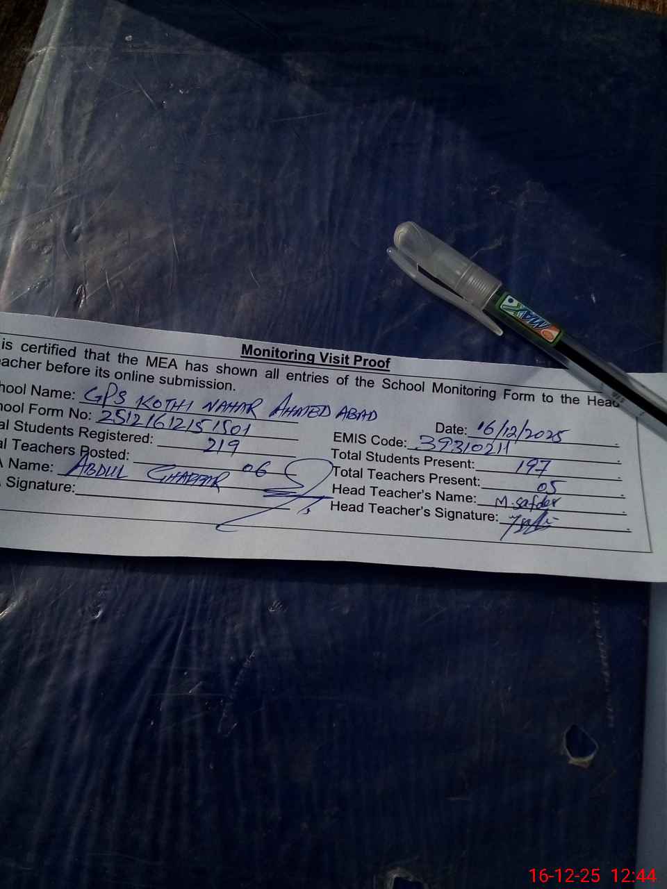 | Attendance Register | Head Teacher | MEA with School | Visit Proof |
