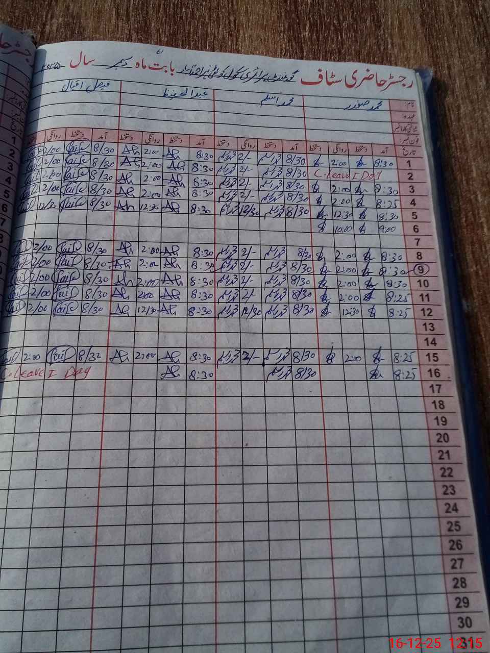 | CNIC | Full Name | Designation | R/C | Absence During Last Calender Month |