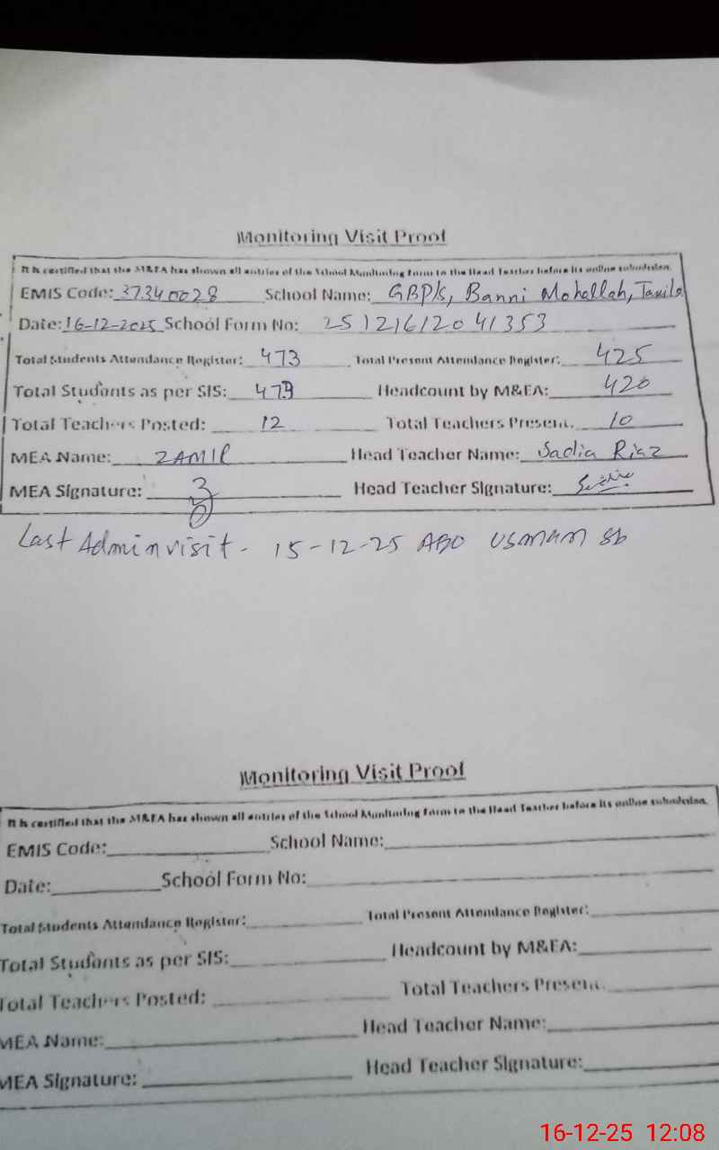 | EMIS Code: 37340028 | Name of School: GPS BANNI MOHALLAH | |||