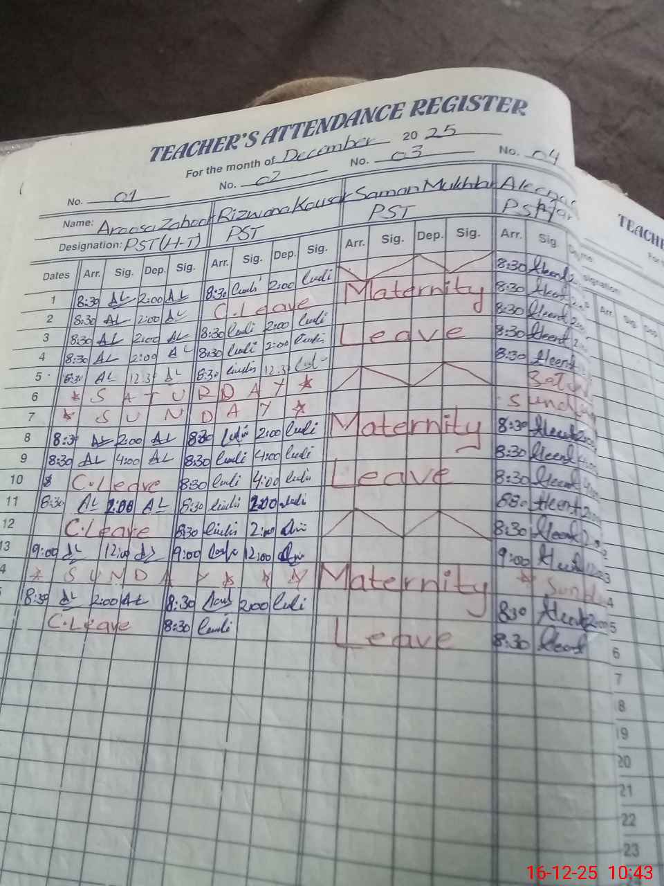 | 37**** | Sa**** Mu**** | PST Science/Maths | Regular | 0 | 0 | 0 | 0 | 0 | 0 | 0 | 0 | 0 | Maternity |