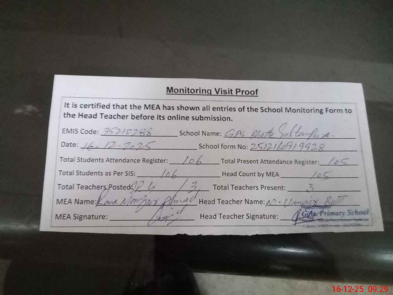 | EMIS Code: 35210288 | Name of School: GPS BHATTE SULTAN PURA | |||