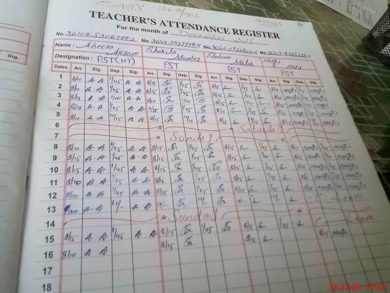 | CNIC | Full Name | Designation | R/C | Absence During Last Calender Month |