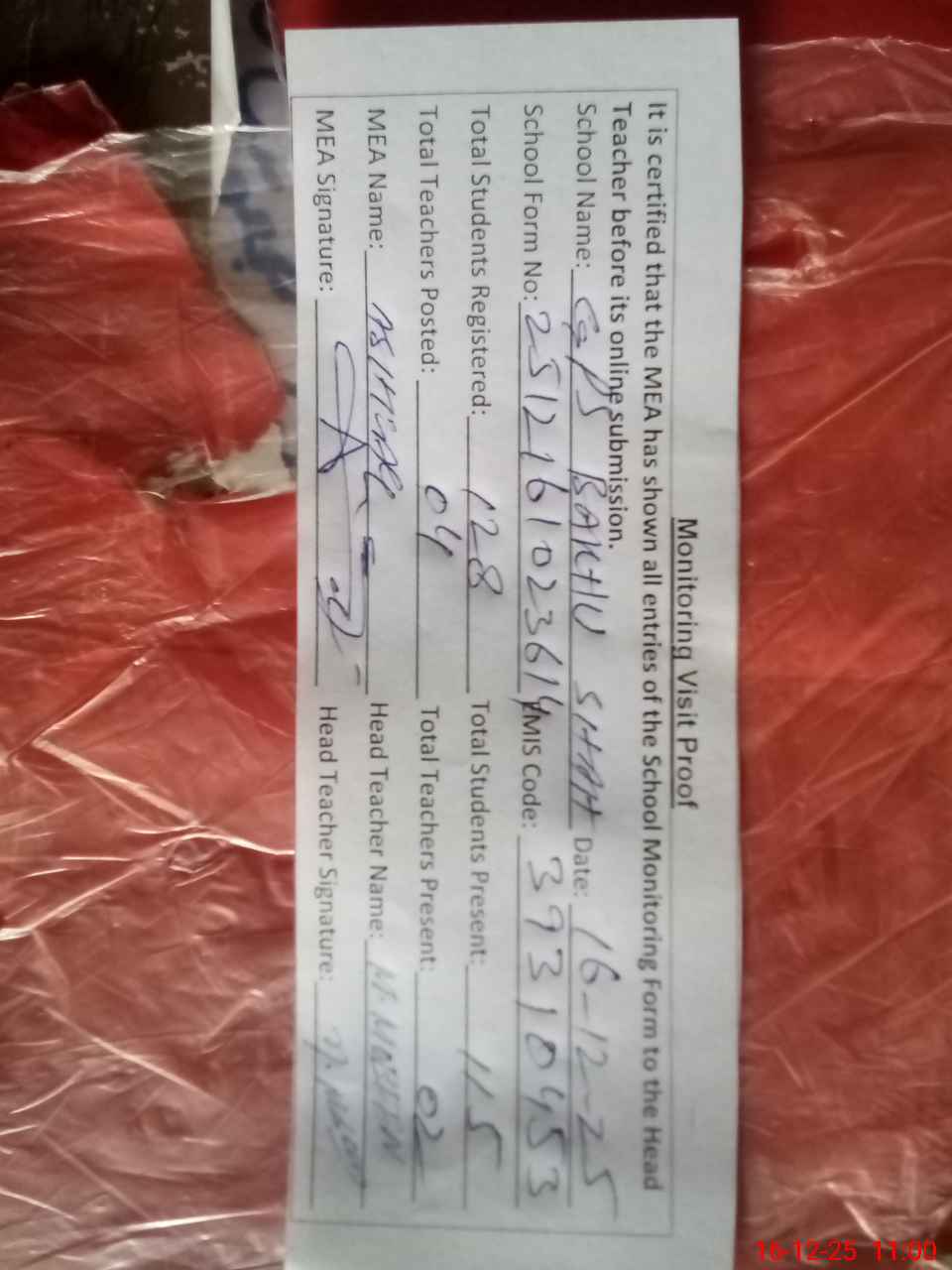 | Attendance Register | Head Teacher | MEA with School | Visit Proof |